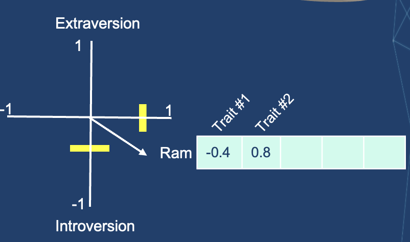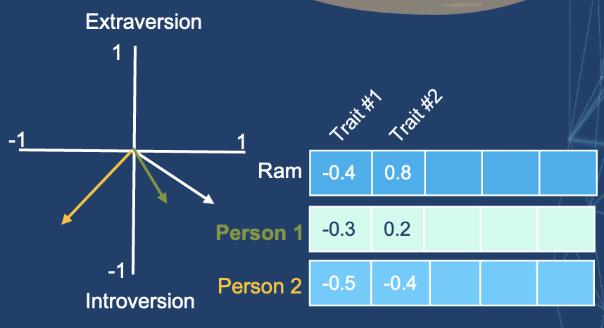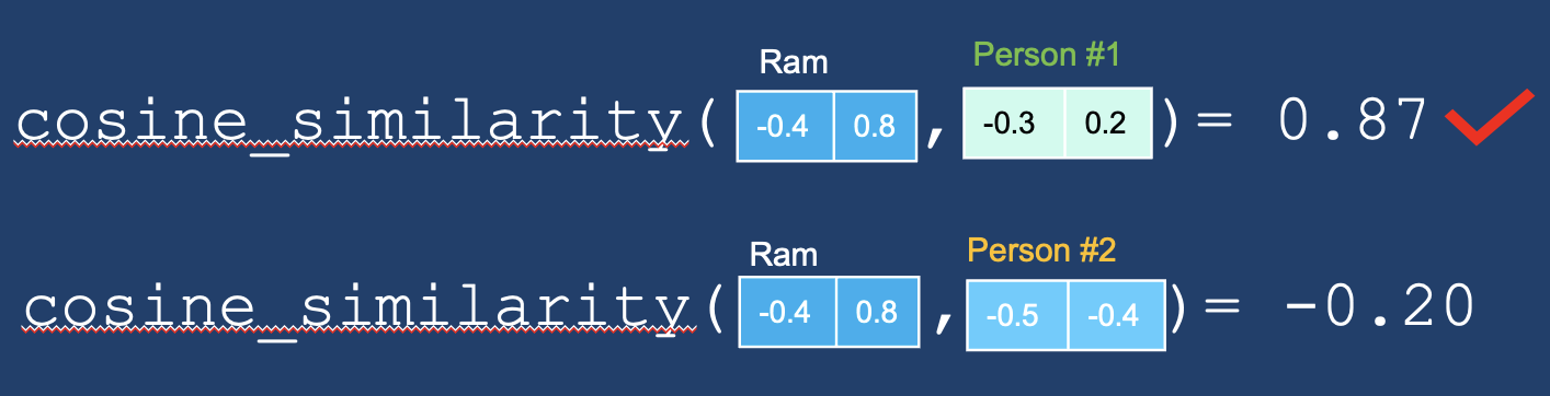 Person #1 is more like me. Vectors pointing at the same direction (length plays a role as well) have a higher cosine similarity score.
