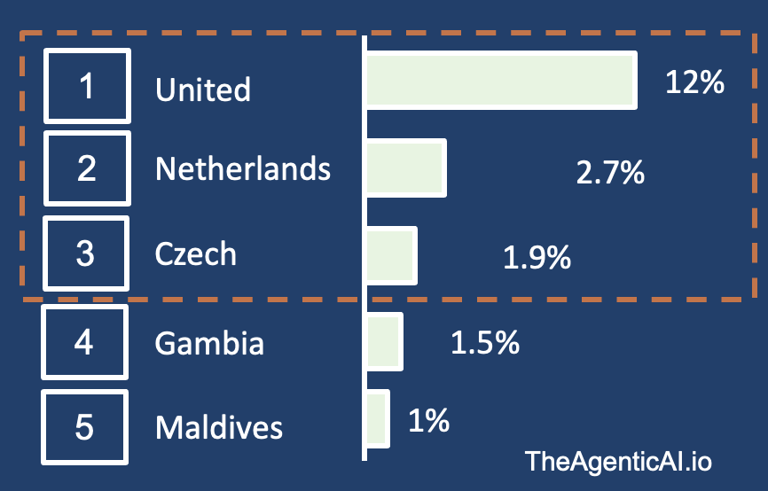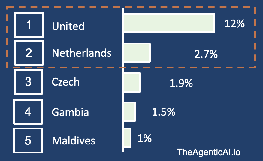 If Top k is set to 3, model will only pick from the top 3 options and ignore all others. Mostly pick “United” but will pick “Netherlands” and “Czech” at times.