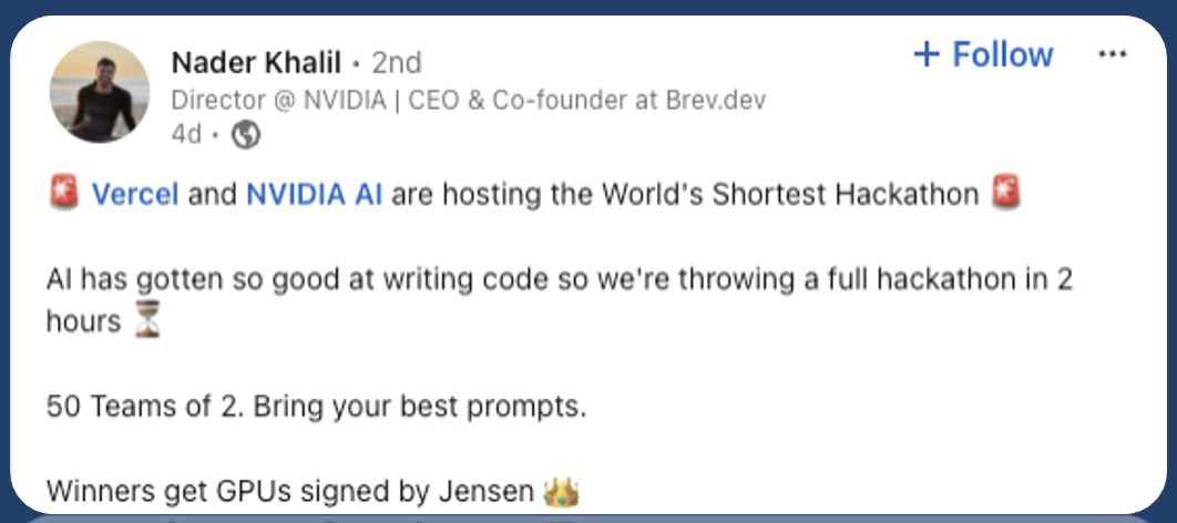 - Real Example: NVIDIA AI, & Vercel hosted world's shortest hackathon (2-hour challenge)